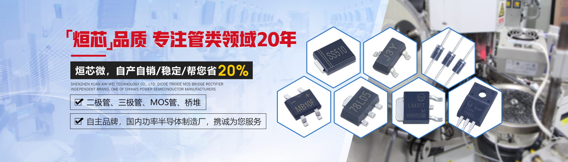 深圳市烜芯微科技有限公司是一家集研发、生产、销售于一体,专注于二极管、三极管,MOS管、桥堆等功率半导体领域发展的企业。采用国际领先的GPP芯片生产工艺及一心多Die高精密制造工艺,拥有功率半导体器件工程实验室,全自动高精密生产设备,产品层层把控,全程可追溯,保障了每只产品的卓越品质。 产品封装包括SMA,SMAF,SMB,SMBF,SMC,SOD-123,SOD-123FL,SOD-323,SOD-323FL,SOD-523,SOD-723,SOT-23,SOT-89,SOT23-3L,SOT23-5L,SOT23-6L,SOT-223,SOT-523,SOT-723,DO-41,DO-15,DO-27,DO-35,R-1,R-6,LL-34,LL-41,TO-277,TO-92,TO-92S,TO-92L,TO-126,TO-251,TO-252,TO-262,TO-263,TO-220,TO-220F,TO-247,TO-3P,TO-264,MBS,MBF,MBM,ABS,UMB,UMSB,DB,DBS,D3K,KBP,GBP,GBU,GBL,GBJ,KBL,KBU,KBJ,KBPC,KBPC6,KBPC8,KBPC-W,DNF,TSSOP-8,TSSOP-16,SOP-4,SOP-6,SOP-8,SOP-10,SOP-14,SOP-16,DIP-4,DIP-6,DIP-8,DIP-10,DIP-14,DIP-16,月产各封装达6亿只。 公司通过了ISO14001环境管理体系认证,产品均获得了ISO9001质量体系认证、UL、SGS等认证,符合欧盟最新RoHs指令。拥有和致力于烜芯微/XXW自主品牌产品的推广,提供技术支持,选型替换,cost down方案及拥有专业的生产管理团队和销售团队,保证了供货稳定及售前选型服务等问题。 公司产品广泛应用于开关电源、适配器、逆变器、控制器、汽车电子、家用电器、通讯设备、无线充、锂电池保护板、驱动电机、安防警报、太阳能光伏产业等多个领域。取得了国内外众多品牌大厂的认可与合作,我们将坚持奉行“烜芯品质,诚信经营,合作共赢”为公司经营理念!竭诚为新老客户提供优质的产品及服务。